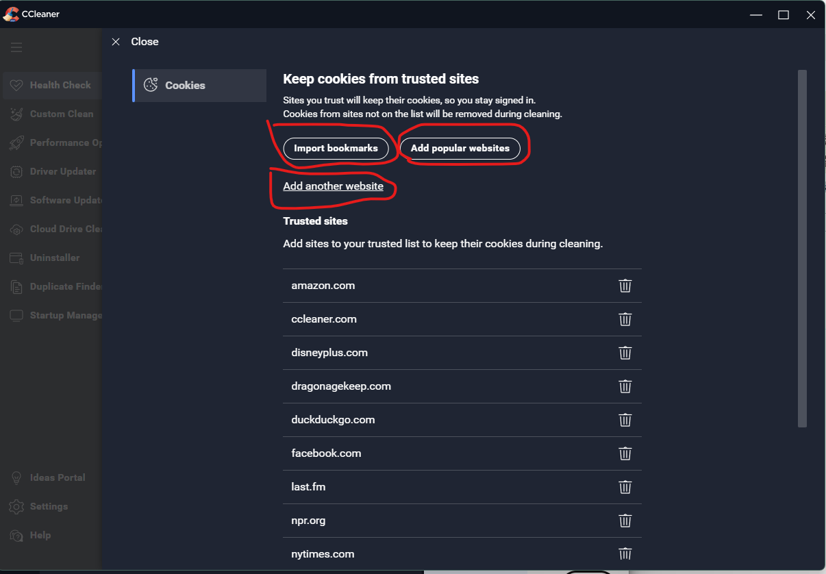CC6 enabled me to see the list of cookies to be deleted, so I could move selected cookies into the Trusted Cookie list. CC7 doesn’t offer that option. How can I select cookies to save before deleting them? Why doesn’t CC7 have the same capability as CC6?