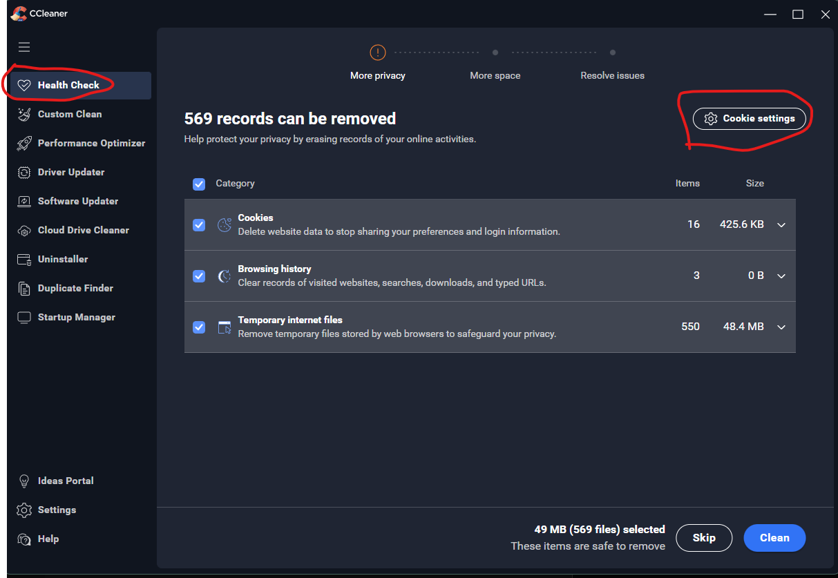 Cookies settings are in the configure (Custom Clean configure in righthand pane, HealthCheck run scan then Cookies Settings in righthand pane)