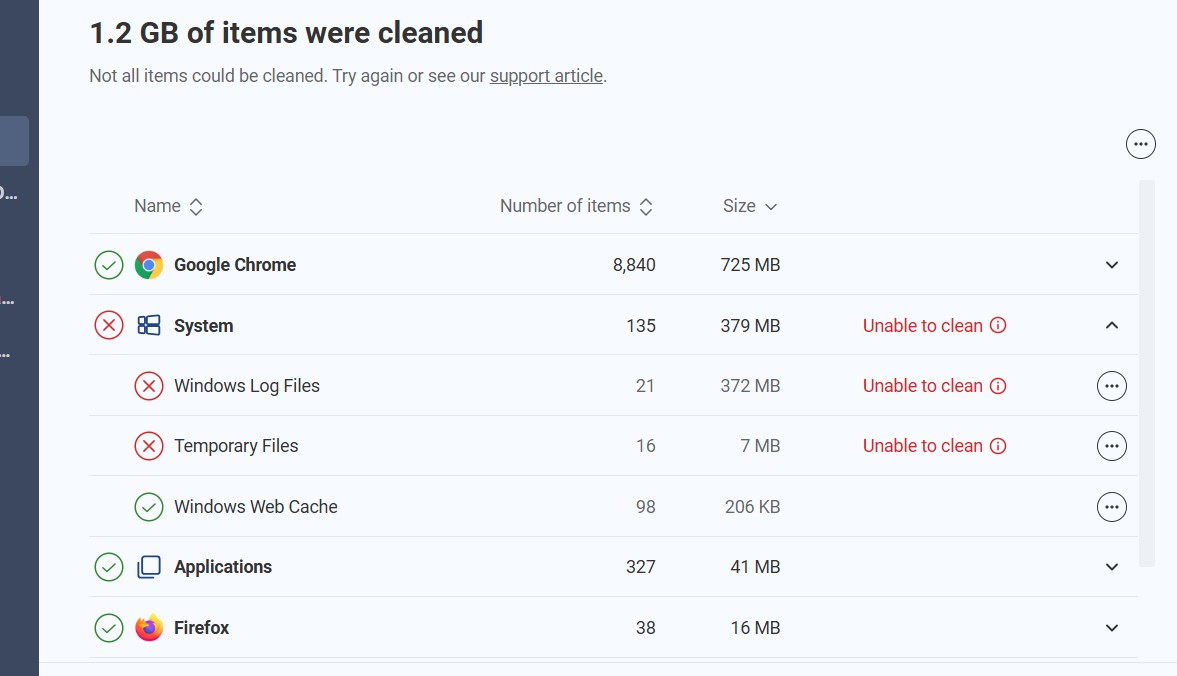 Attached is a screenshot of Beta; I’ll attach a ss for the other version in a reply (if I’m allowed, as I’m new). The SS were taken withn a minute of each other. Curious why Beta was unable to clean certain Windows files.