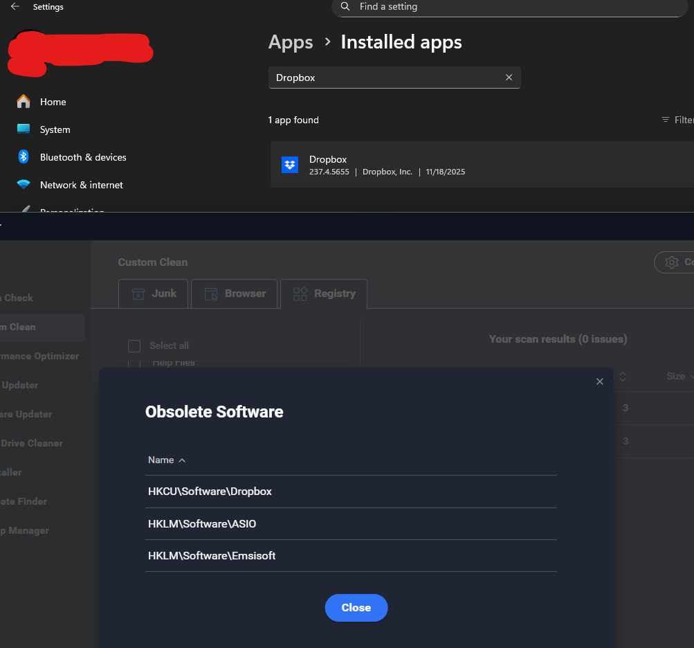 as you can see Dropbox (one of the entries) is definitely installed and RUNNING AT THE TIME. ASIO is a driver type for audio devices. I did not have the device connected so i can see it coming up obsolete but I still don’t want to erase it.