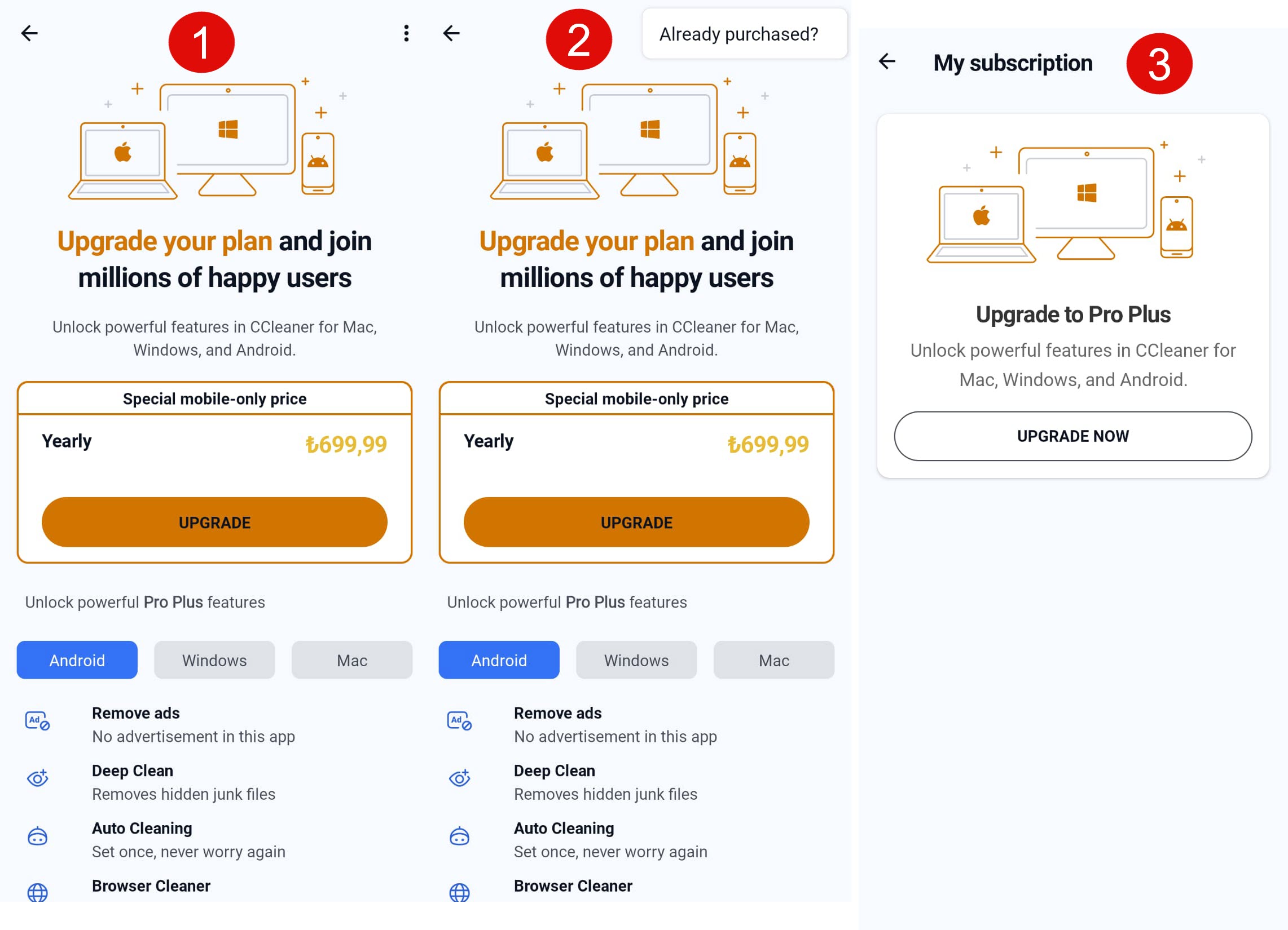 I bought 3 device license yesterday and used two of them in two devices, and the last one i wanted to use it on android. I installed CCleaner for android from google play store. In the My subscription screen there is no “Use an activation code”. thats why i can’t enter my license. I can provide ss, or you can download and see it by yourselves.