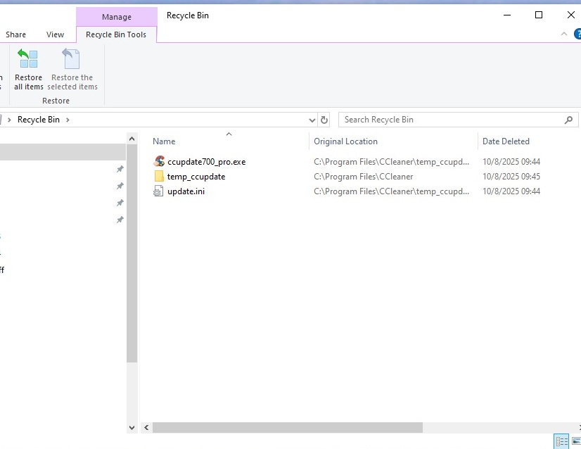Now this morning I found that version 7 wanted to install it’s self again, I looked in the CCleaner folder and found an auto update program for version 7, I deleted it and the folder, here is a screen shot of the recycle bin.