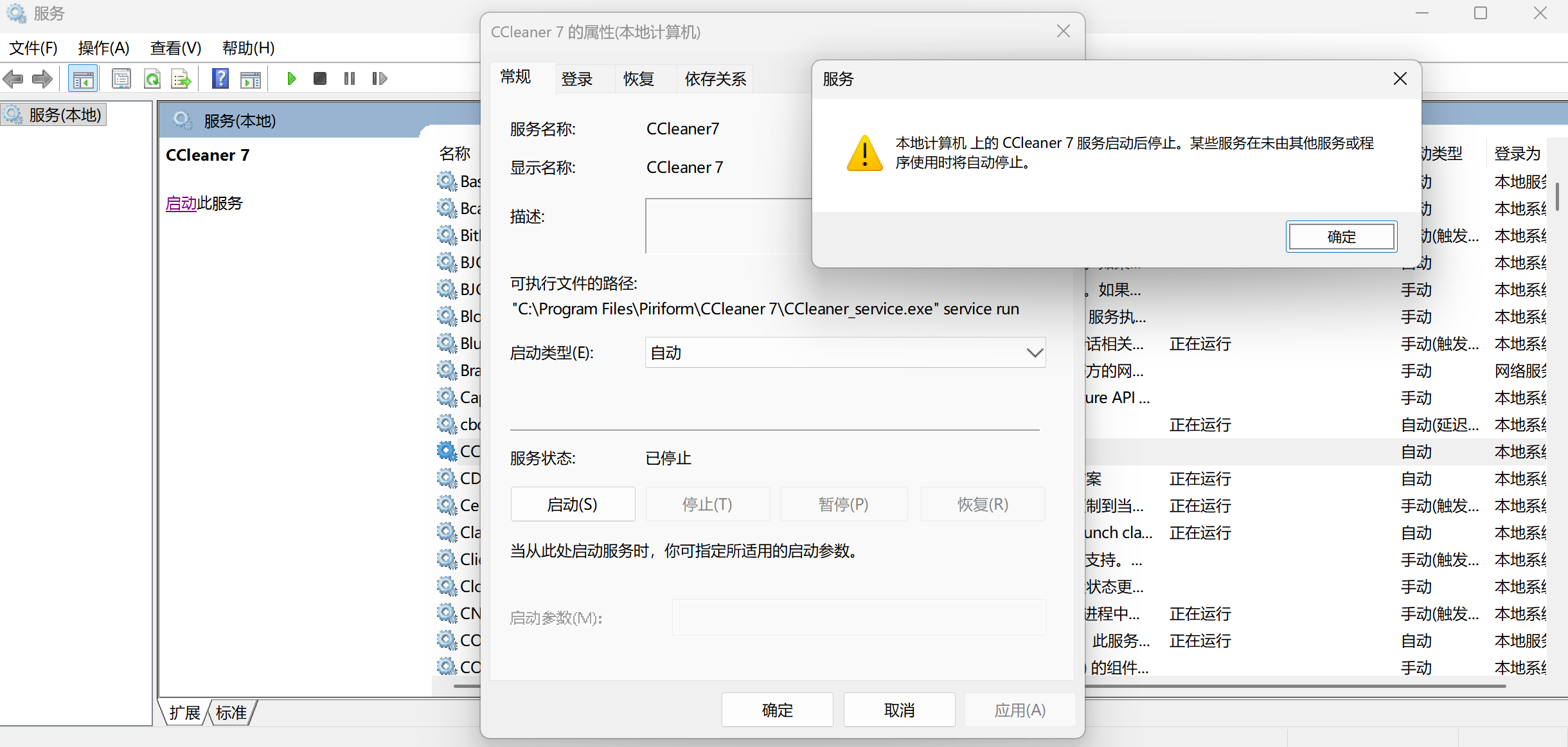 The warning says Ccleaner 7 services on the local computer started and then stoped. some services will stop automatically if not used by other services or programs.