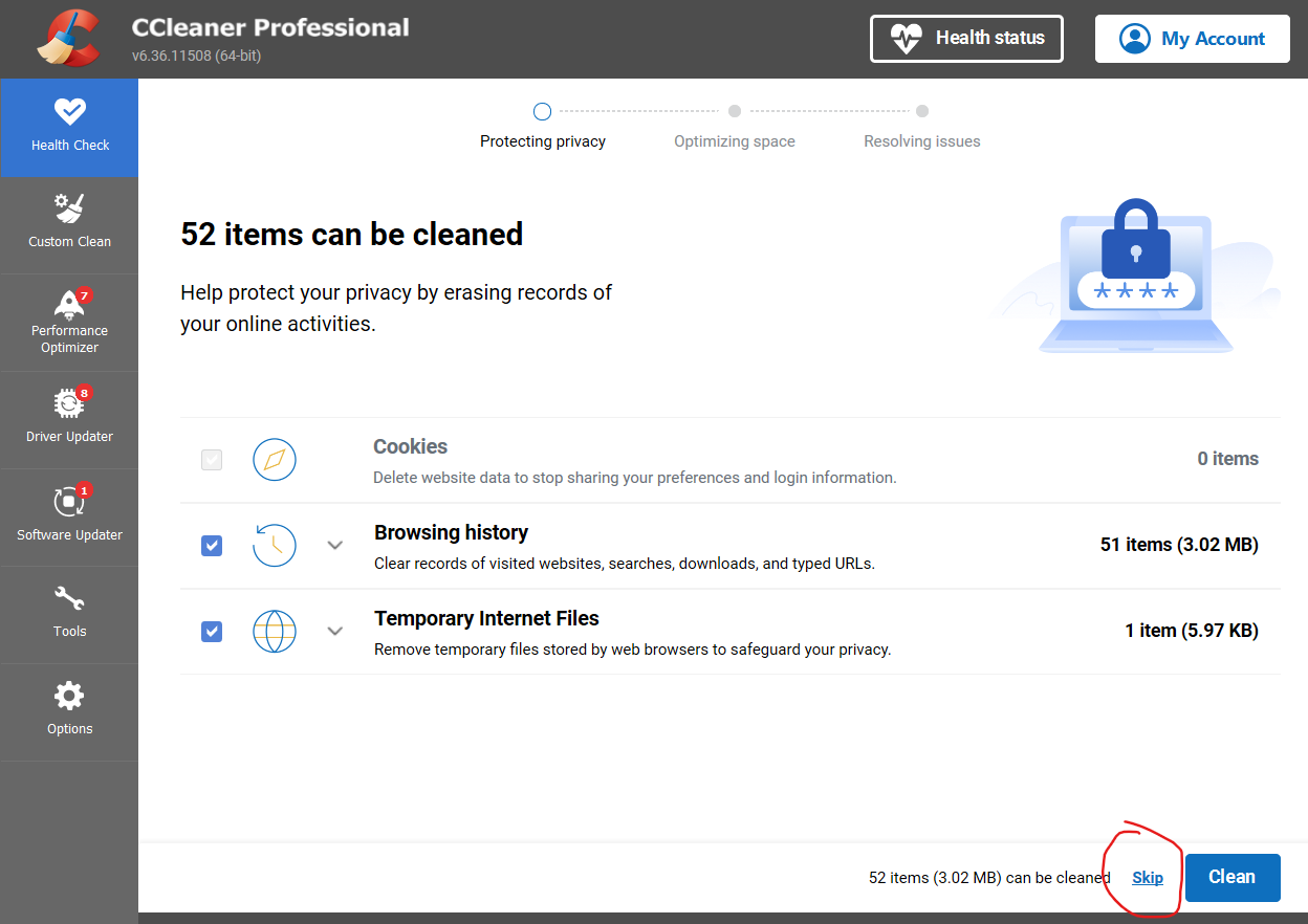 I have never run the Health Check feature because I did not purchase the software for that function. The software was purchased to for the cleaning functionally only.