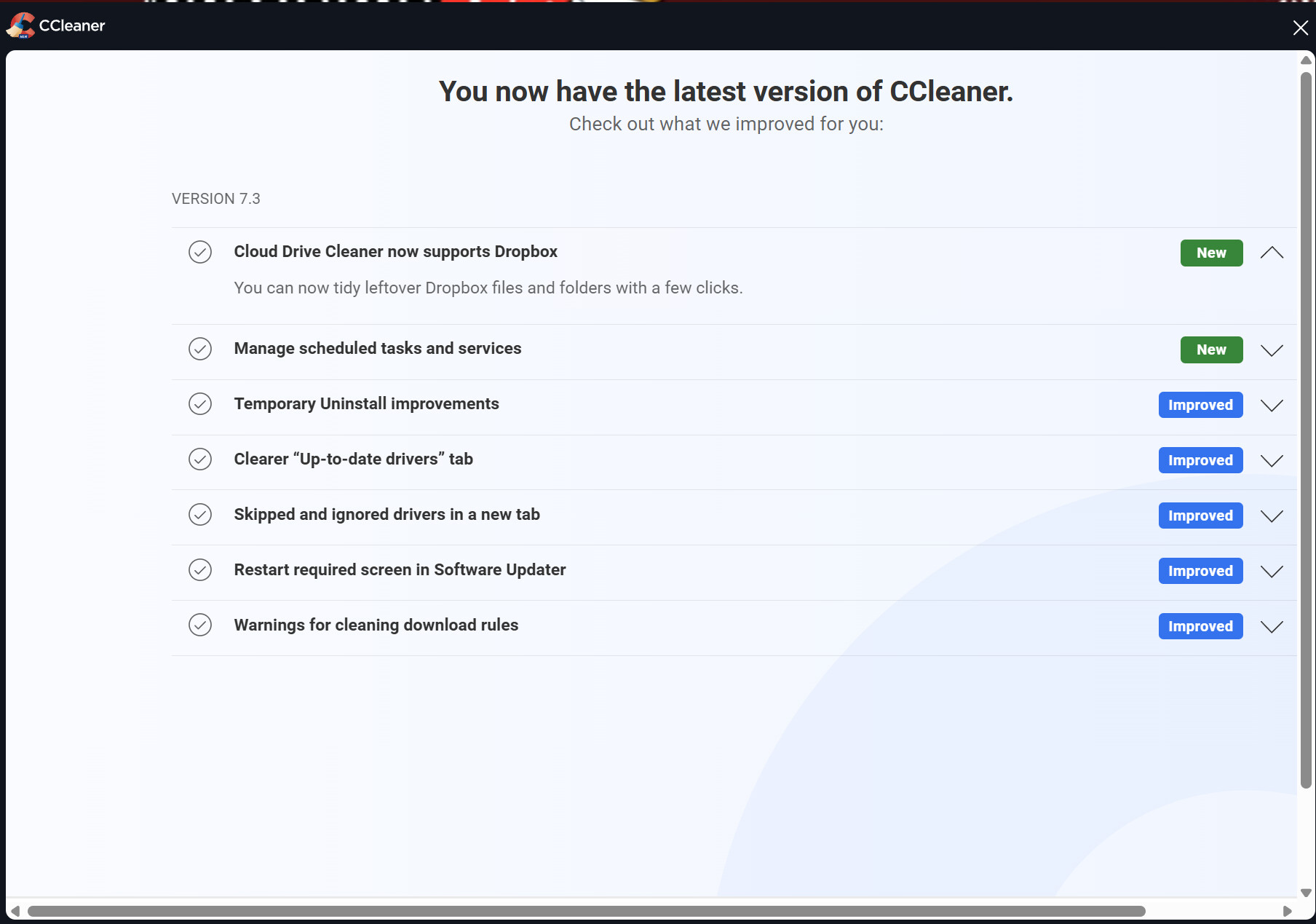 Several times a day, a notification appears saying that I have updated CCleaner version 7.3.1120.0, although this is not true, as it is a recurring notification, which is extremely annoying. There are many similar notifications on the net, but, as users say, there is no response from the CCleaner administration. I ask you what is happening and when do you plan to fix this, more than obvious error.