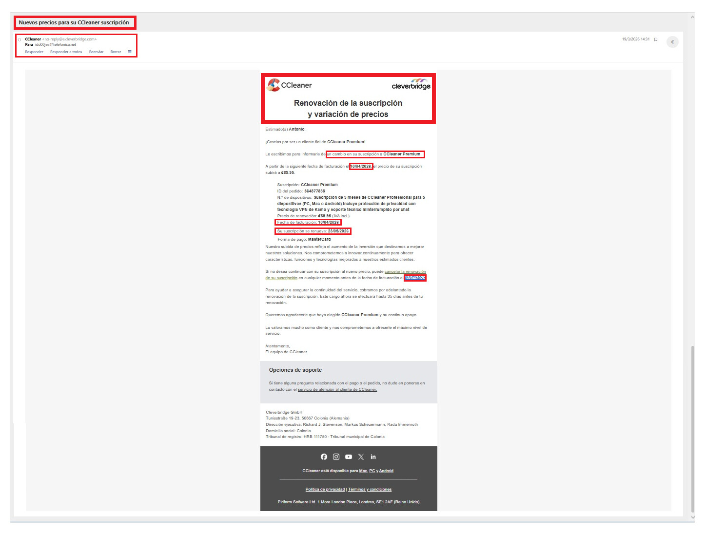 He recibido un aviso de renovación con una fecha 18/04/2026 que no se corresponde con la real que es el 22/04/2030.