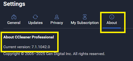 I have never used a CCleaner v7.x product, but according to the support article Configure Settings in CCleaner 7 if you click the Settings button (“gear” icon) near the bottom-left corner of the main interface and choose the About tab this will display your CCleaner edition and version number (e.g., CCleaner Professional v7.4.1172). From an image I found on the web: