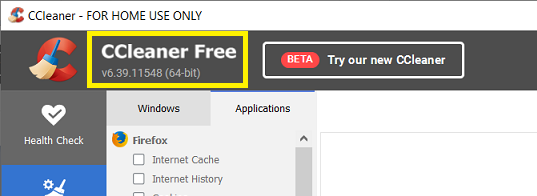 If you are using an older CCleaner v6.x product your CCleaner edition and version number (e.g., CCleaner Free v6.39.11548) are displayed in the top-left corner of the main interface.