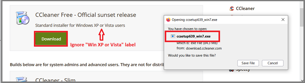 NOTE 1: Ignore the fact that the current legacy installer is labeled “Standard installer for Windows XP or Vista users”. CCleaner v5.64 was the last version compatible with Win XP and Vista and it now appears Avast / Piriform has removed the SHA1-signed v5.64 full offline installer for Win XP and Vista from that official builds download page and replaced it with a v6.39 installer intended for Win 7 SP1.