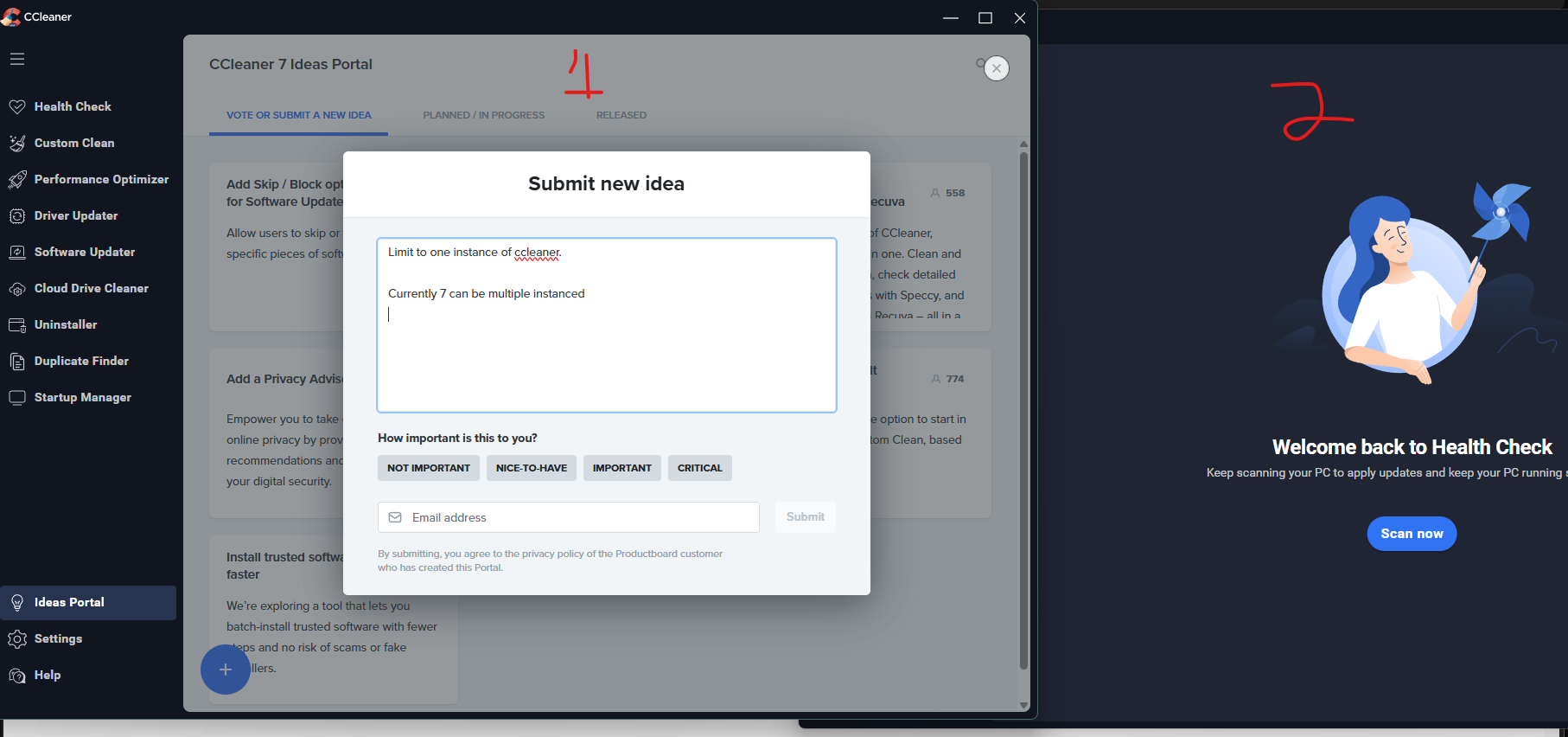 Currently you can open many windows of ccleaner at once, this may confuse users who start a scan on one and see the other not scanning