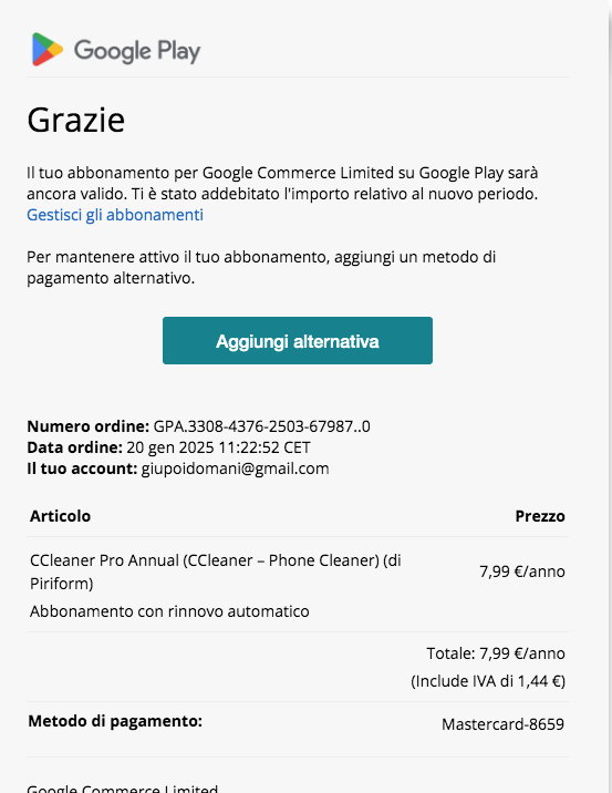 INFATTI NON TROVO ANCH’IO LA MIA LICENZA MA CERTAMENTE HO UN ABBONAMENTO ATTIVO E, A RIPROVA, VI ALLEGO COPIA DELLA FATTURA RELATIVA AL RINNOVO DA ME PAGATO IN DATA 20 GENNAIO 2025, CON PREGHIERA DI RISOLUZIONE DEL PROBLEMA .CORDIALMENTE. MI AVETE RISPOSTO CHE A VOI NON CORRISPONDE NESSUN ACCOUNT ATTIVO COLLEGATO ALLA MIA MAIL, MA LO SCREENSHOT ALLEGATO VI DIMOSTRA CREDO IL CONTRARIO. QUINDI CREDO CI SIA QUALCHE PROBLEMA NELL’ASSOCIAZIONE DEL MIO ABBONAMENTO CON LA MIA MAIL.