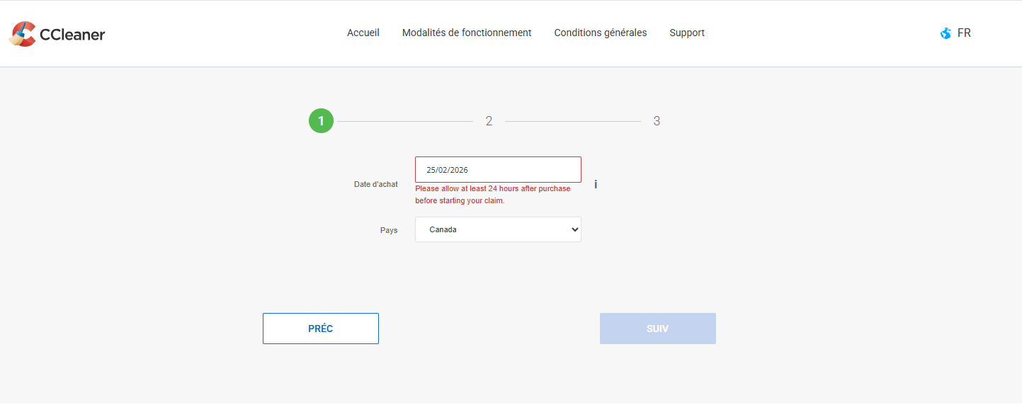 Ce message s’affiche sur la page de demande de remboursement si vous sélectionnez aujourd’hui comme date d’achat.