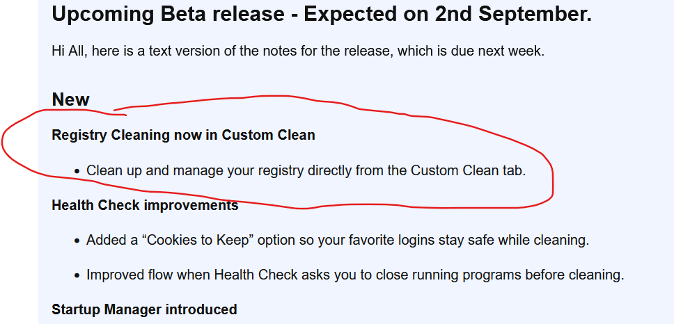 PS. We were told that Registry Cleaning was added to the Custome Clean tab in the V7 Beta at the start of September, is your v7 Beta version up to date?