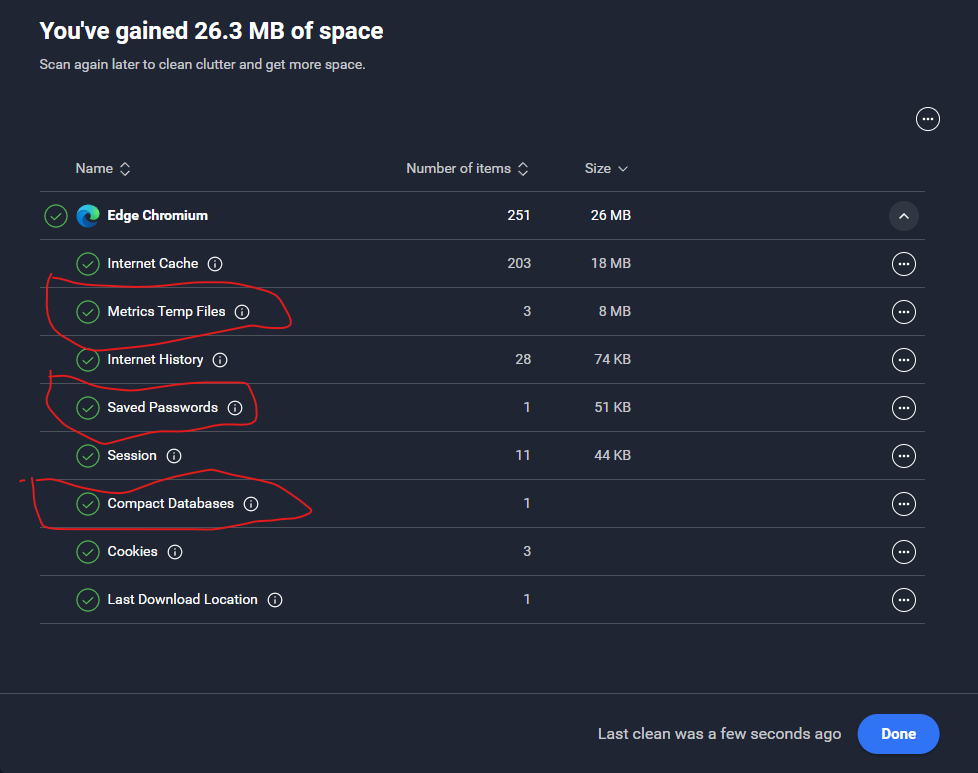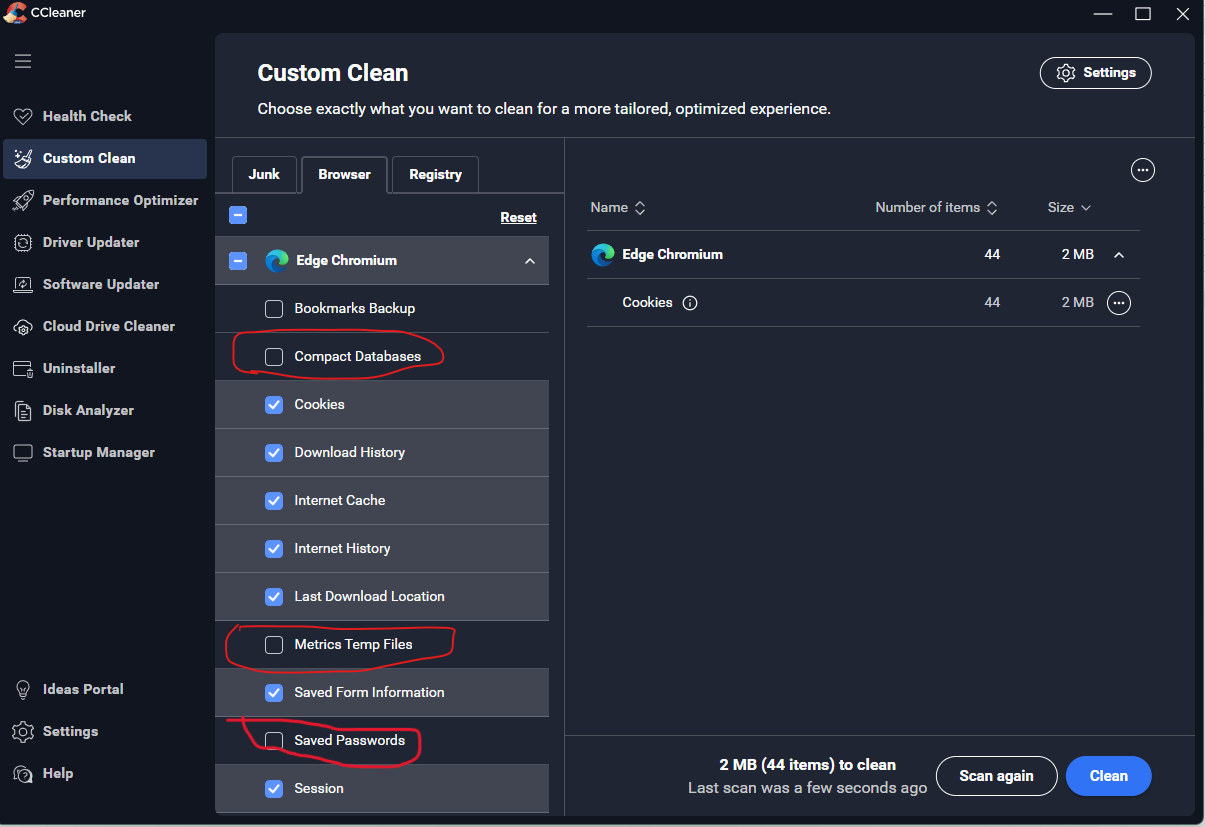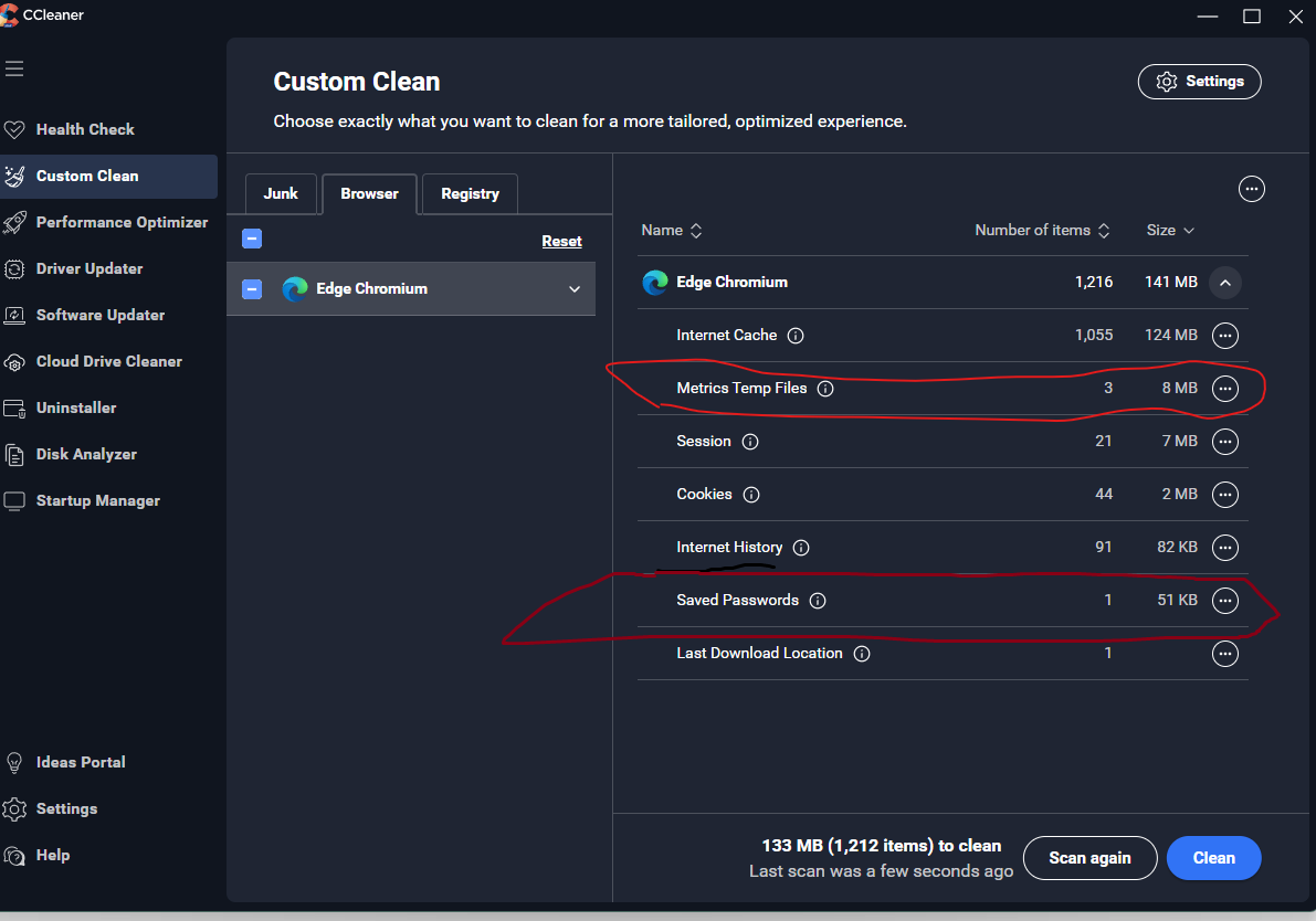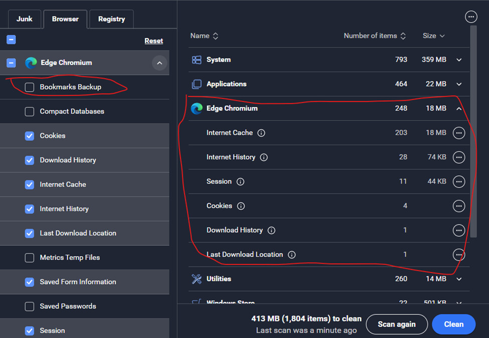 First, I ran a scan (right click edge browser choose scan), and it shows items in the ignored selections (Saved passwords, metric files)