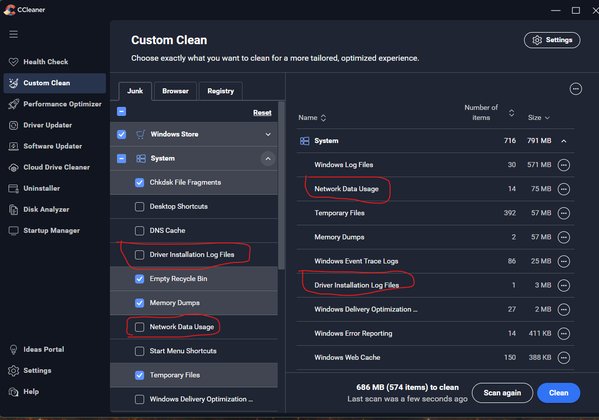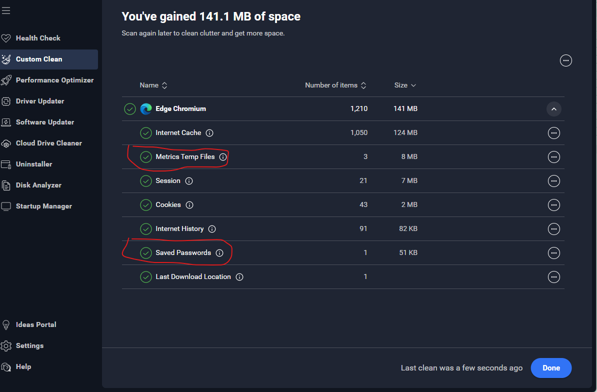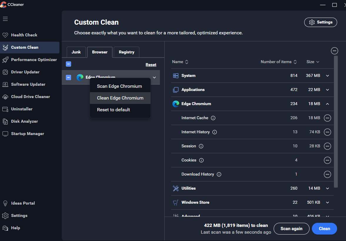 First, I ran a scan (right click edge browser choose scan), and it shows items in the ignored selections (Saved passwords, metric files)
