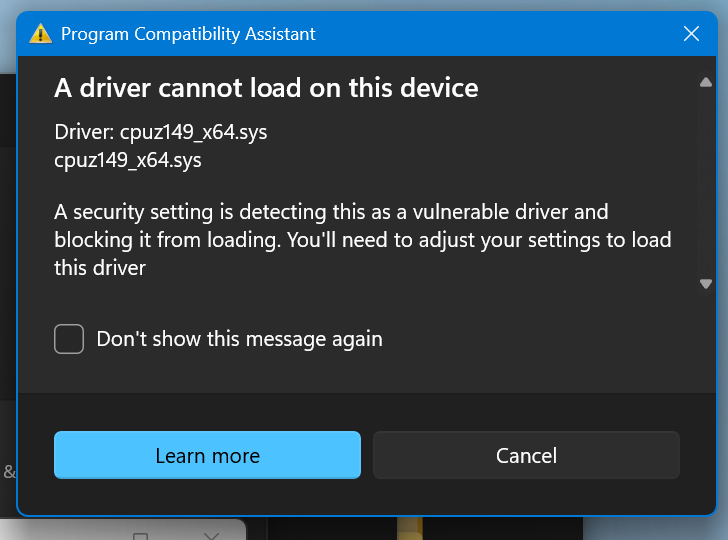 Launching Speccy Pro on my MS Surface Laptop Studio 2 running Windows 11 Pro (x64) Version 25H2 Build 26200.7623, opens the error window per the below image. I did some research and found that the Windows Security Memory Integrity feature regards this driver version as an outdated security risk. I don’t want to disable Memory Integrity as that exposes the Windows Kernel. The current version of this driver from CPUID is v2.18.0. I installed the CPUID utility CPU-Z that uses the current driver. I can open and run CPU-Z without Win11 Pro throwing an error. If you’re not planning to soon release a Speccy update with a Win11 Pro safe version of the cpuz driver, can you tell me how I can manually update the Speccy copy of cpuz149_x64.sys to the current version of the driver? Thanks.