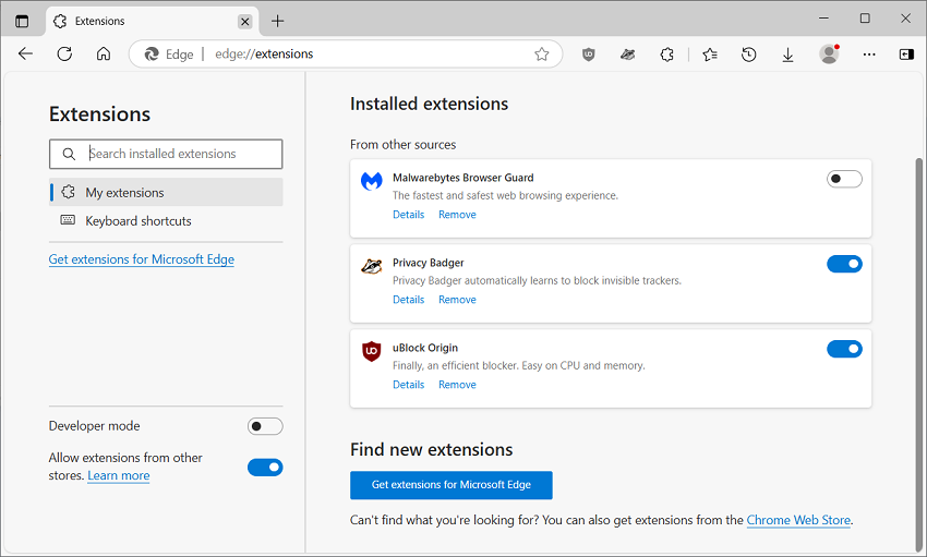 I have three extensions installed in MS Edge (Privacy Badger and uBlock Origin are enabled, Malwarebytes Browser Guard is currently disabled - see image below) so I don’t see how those two IEToEdge BHOs (Browser Helper Objects) listed on my Internet Explorer tab could have anything to do with my MS Edge extensions. I doubt it’s relevant, but all three of my MS Edge extensions were downloaded from Google’s Chrome Web Store.