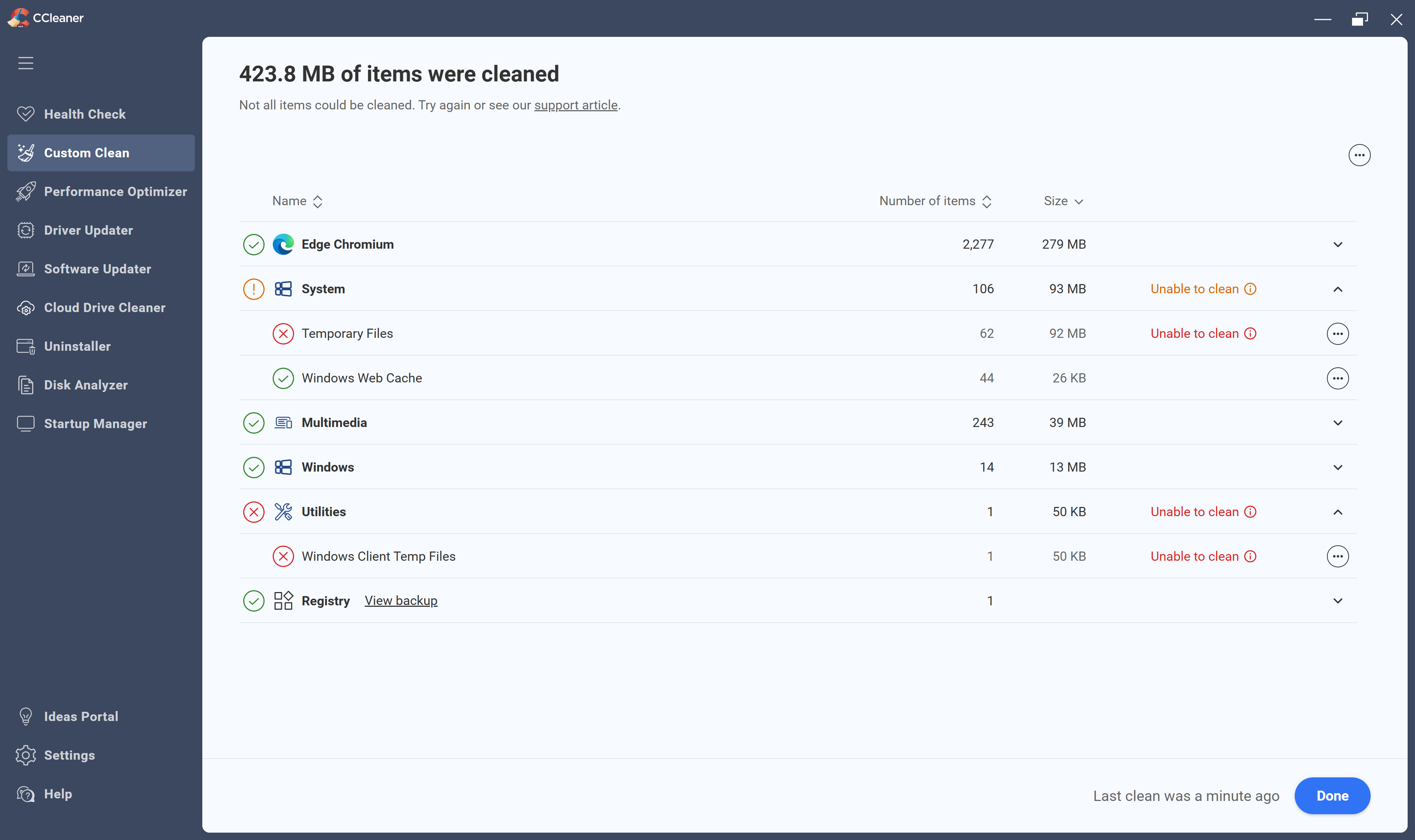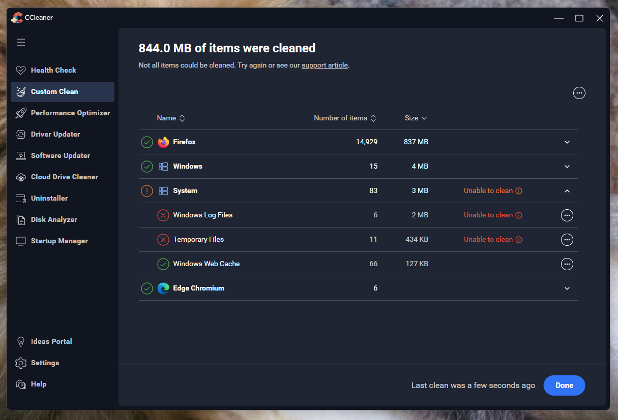 Hovering over the little Info icon says “some items couldn’t be cleaned. Try again or see support article”. Couldn’t find any support info. Clicking on the link at the top of the page just goes to CCleaner home page.