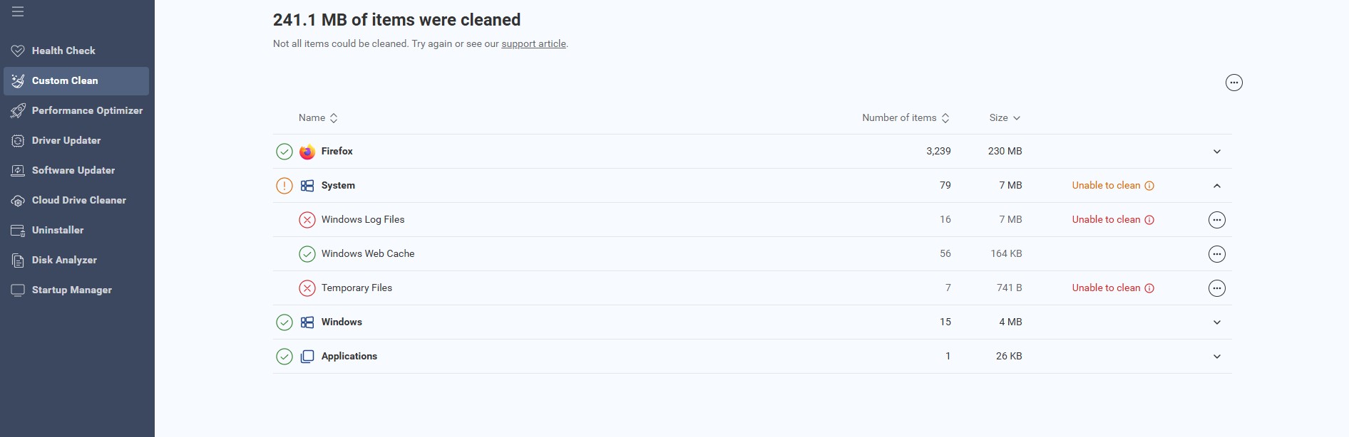 Most cleaning failures, such as this, are due to applications being open at the time of the clean and so the files canât be deleted.