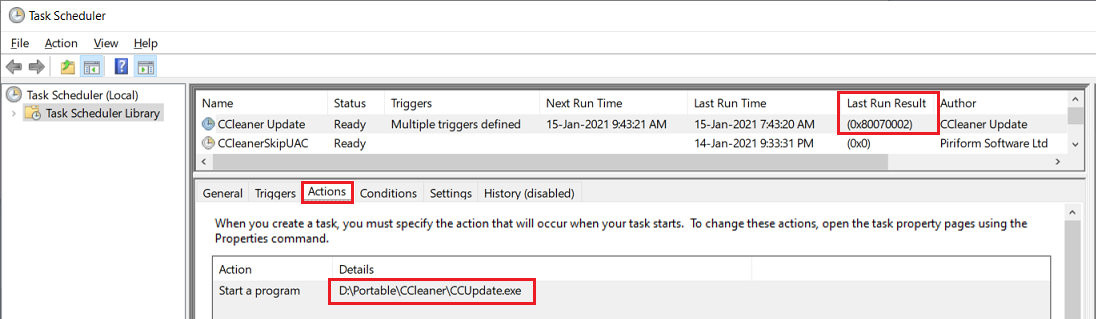 Open Task Scheduler and look for that scheduled task named “CCleaner Update”. If present, just right-click and choose “Delete” from the pop-up context menu to remove the task and stop it from running. Here’s an old image I captured in January 2021 when I was using CCleaner Free Portable v5.76 that shows that task.